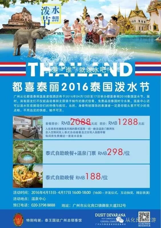 广州从化都喜泰丽温泉度假酒店将于2016年4月13日至4月17日举办主题为“爱‘谁’就泼水吧”都喜泰丽2016泰国泼水节 。